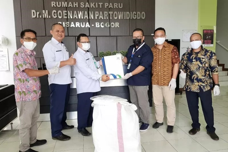 Group Head PKBL dan CSR Indonesia Re Freddy Aries Setiawan (ketiga dari kanan) menyerahkan bantuan APD kepada perwakilan RSP Cisarua